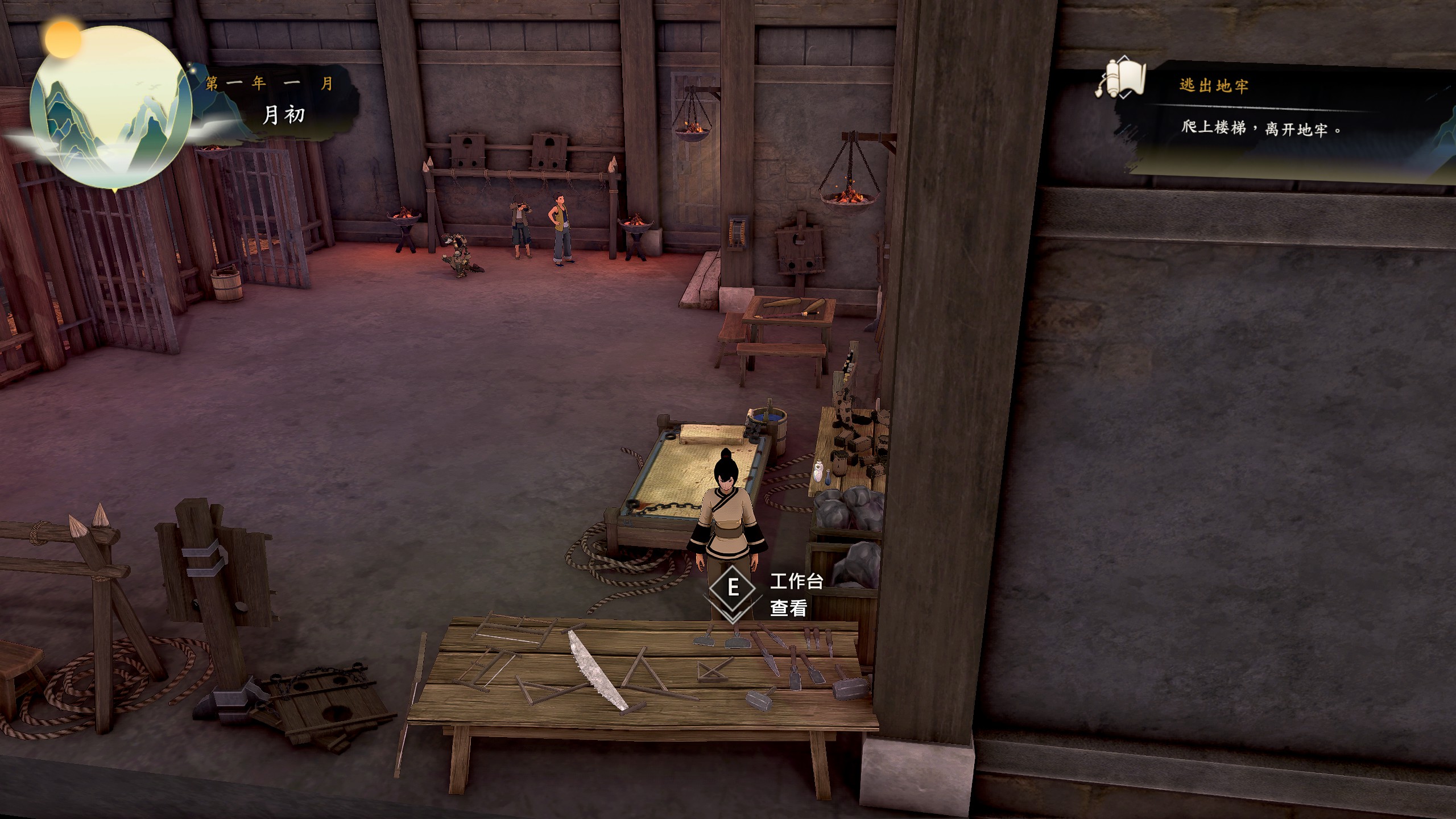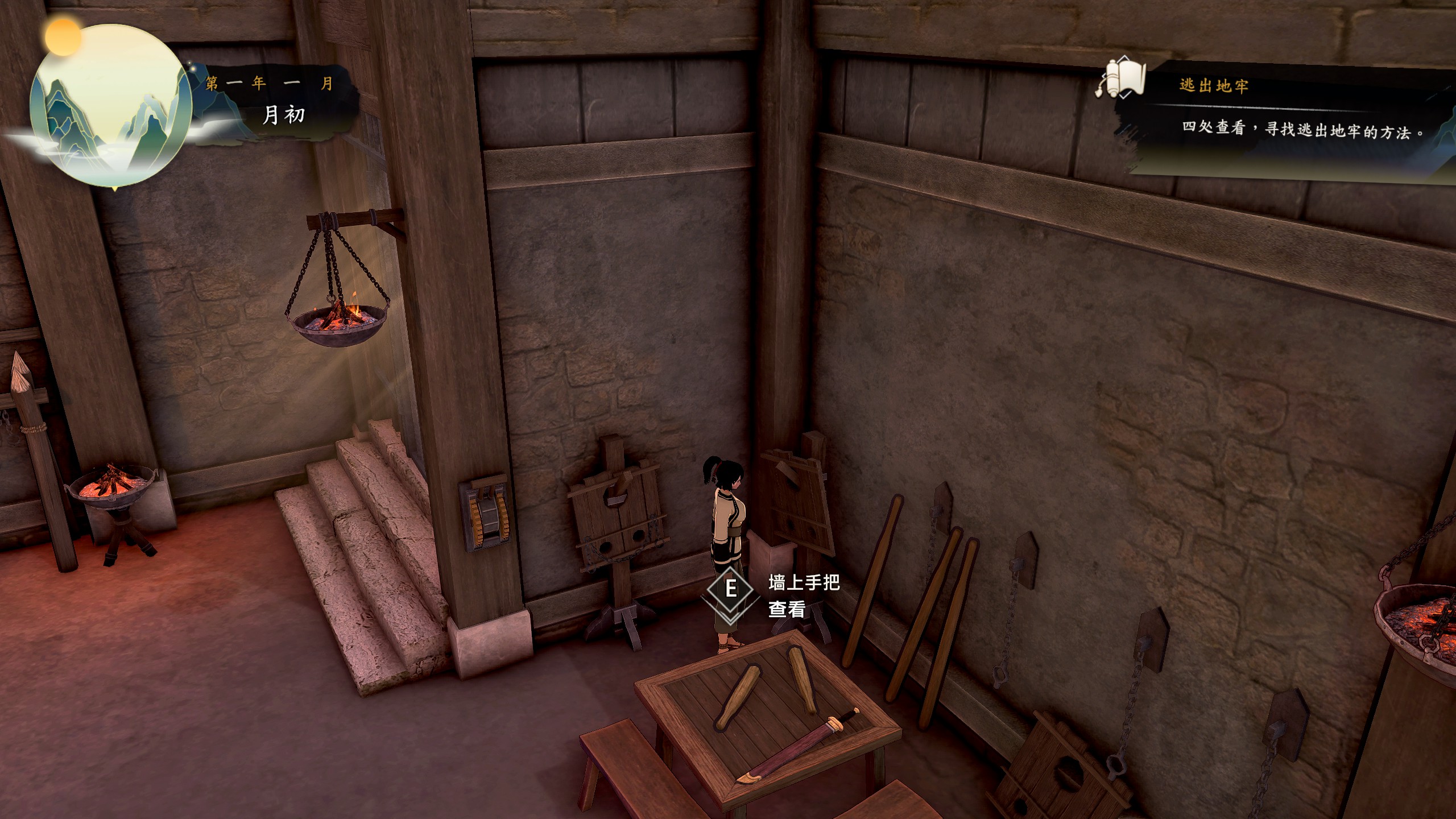 过完开场剧情后,我们来到了一个地牢,走到下图位置,拉下把手就可以离开地牢,但别急,还有些东西要收集。